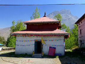 The Mharme Lha Khang Gompa (which translates as thousand holy lamps) lies to the north-west of the main Muktinath temple, and contains the statue of famous Guru Rinpoche (Padmasambhava). As this monastery is dedicated to Guru Rinpoche, his huge clay image is placed at centre of altar along with the Bon deities: red Dragpo at the right side and blue Senge Dongma at the left side.