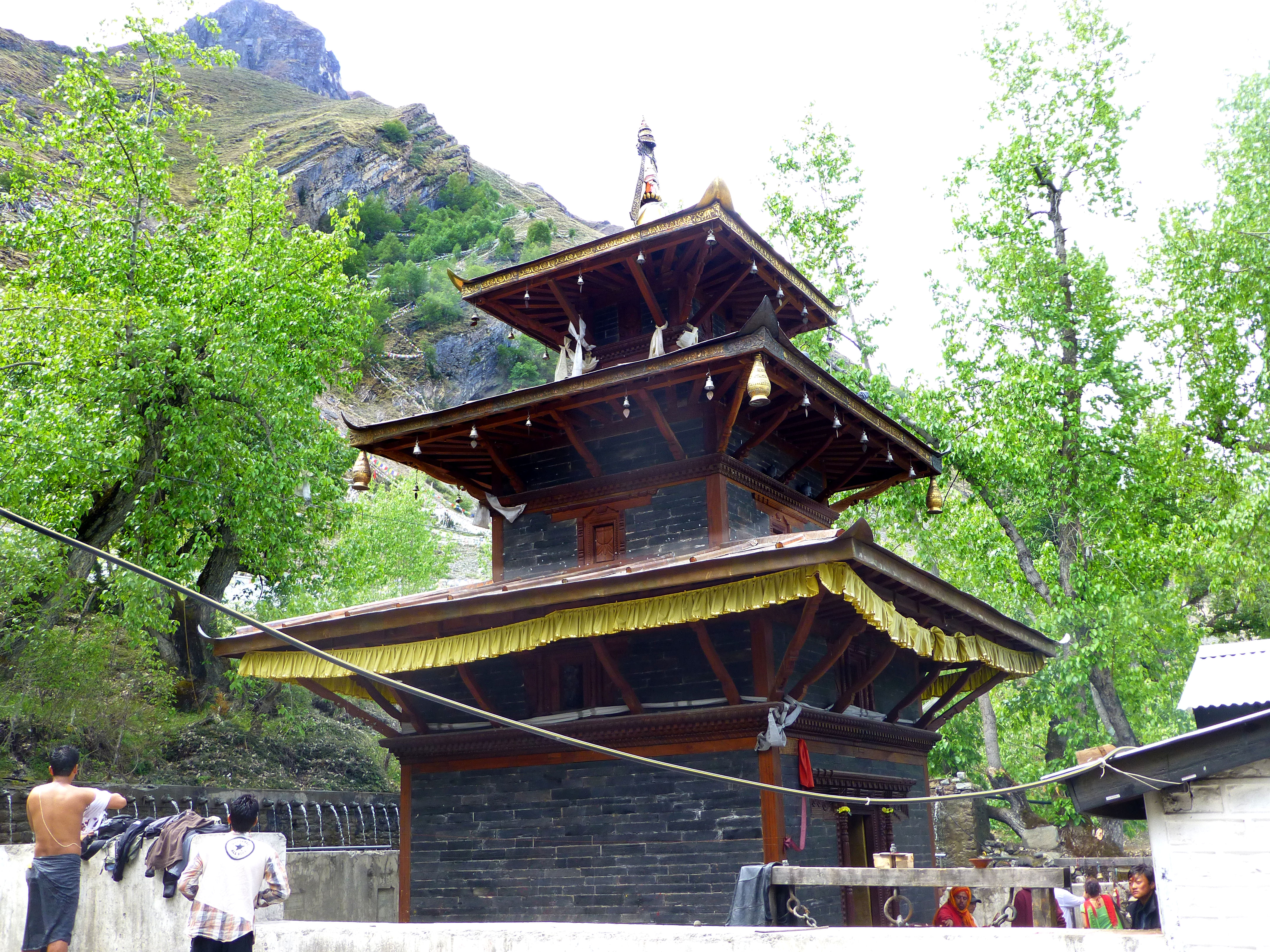As you enter the walled complex, lined by Tibetan-style prayer wheels, you pass first the Gompa Sambha (First Monastery) on the left and then a Shiva Temple ringed by four smaller shrines. The focal point oft the complex is the Mukti-Kunda pool and its 108 brass waterspouts, cast in the shape of 'cows' heads, which pour forth sacred water. Usually pilgrims bathe in the frigid waters.